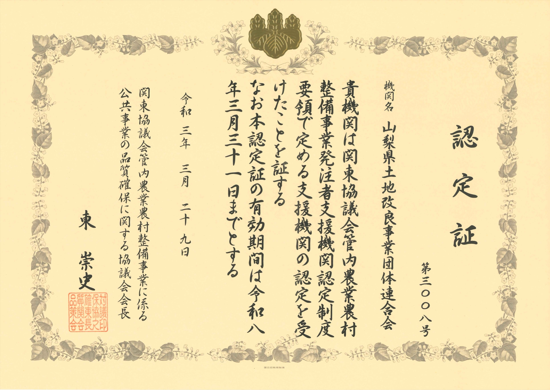 平成17年4月1日付けで「公共工事の品質確保の促進に関する法律」が施行され、公共工事における品質確保に関する責任の明確化が図られるとともに、 公共工事の発注者(市町村等)の発注関係事務の適切な執行が求められることとなった。これをふまえ農業農村整備事業に係る工事の適切な発注関係事務を支援するため、 「農業農村整備事業発注者支援機関認定制度」が創設され、平成19年1月23日付けで「関東協議会管内農業農村整備事業発注者支援機関」として本会が認定されました。